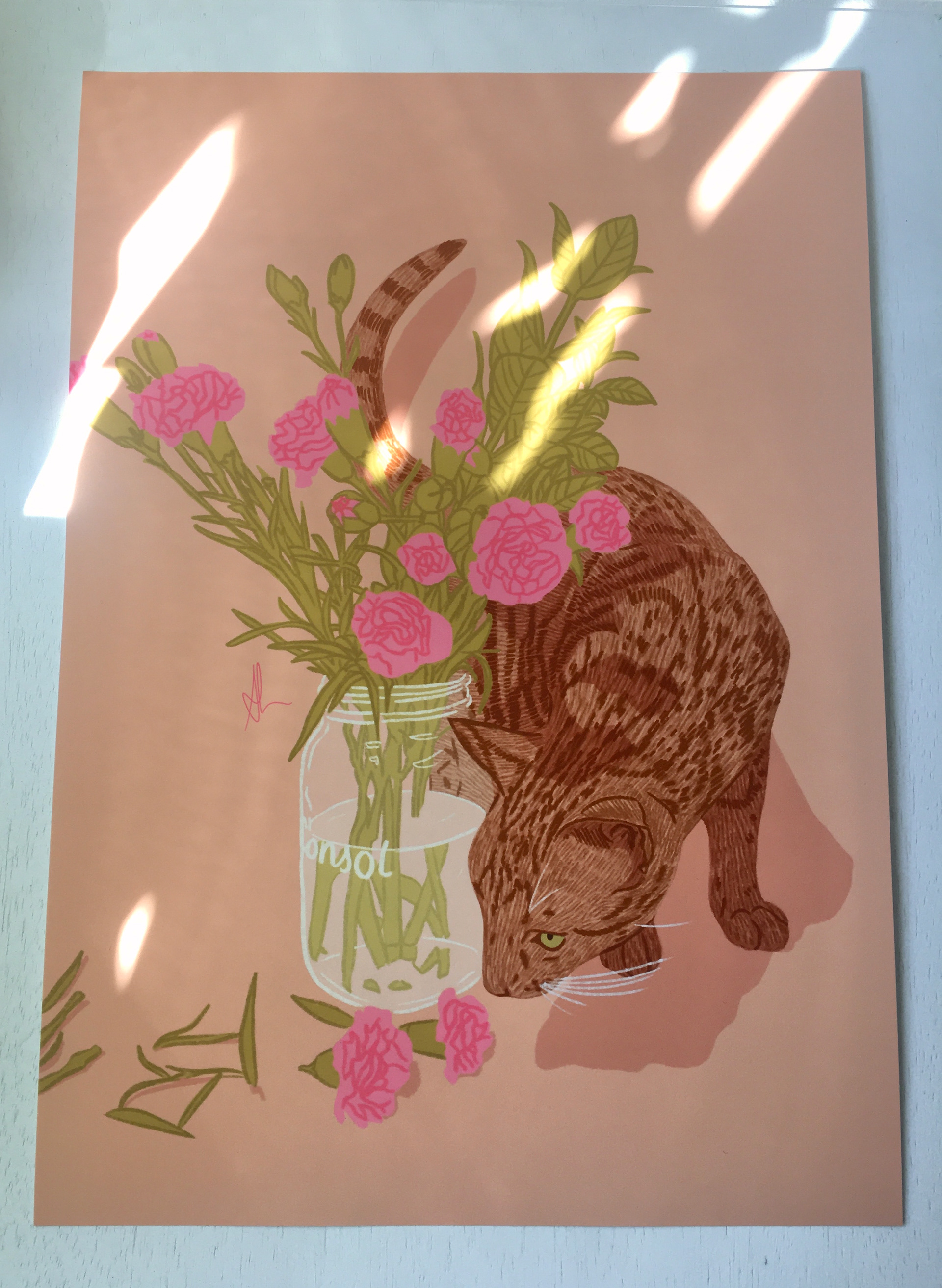 Inspired by a photo taken of my cat with a bouquet of pink carnations.
