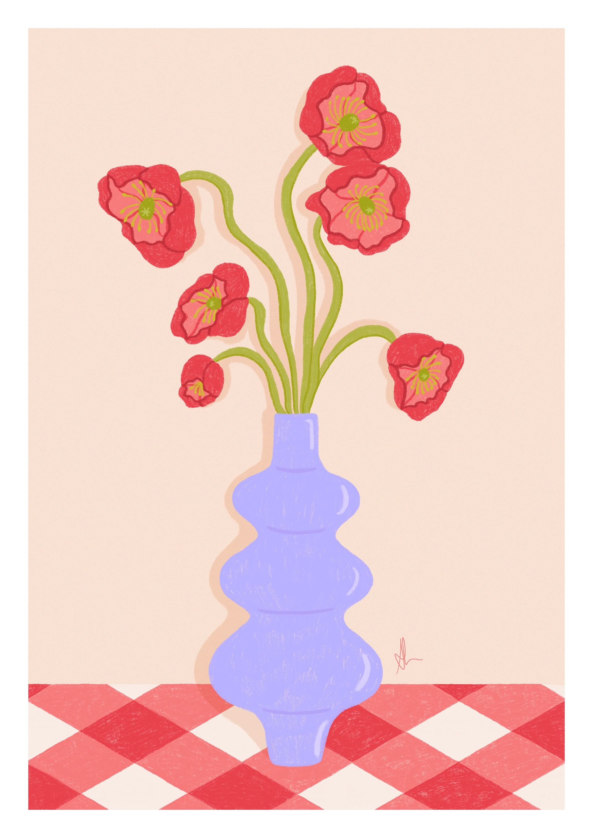 This still life illustration features six blooming poppies in a geometric mid-century modern vase. There is harmony between the curves of the stems and curves of the vase, while the gingham tablecloth creates contrast.