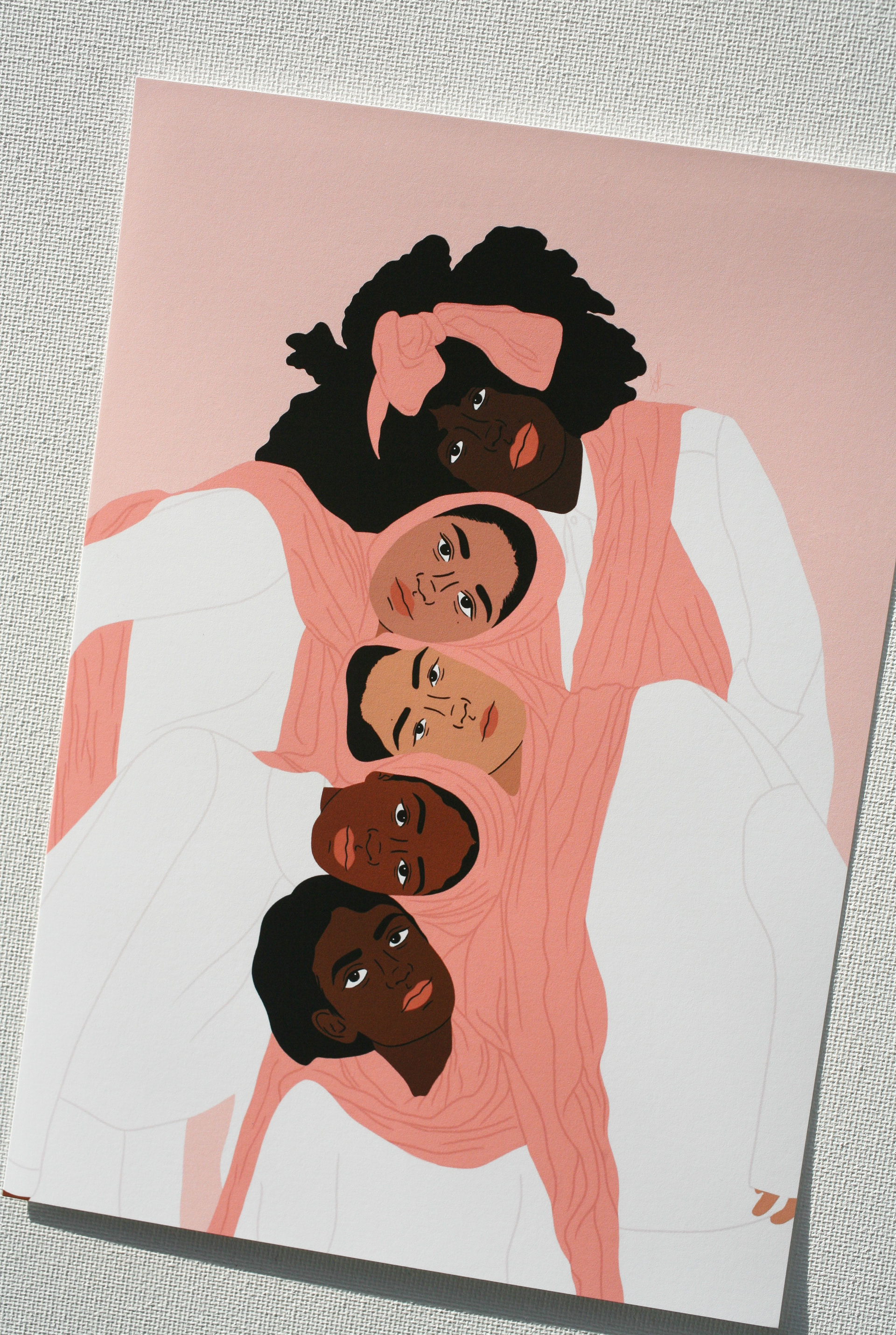 Created in honour of Women's Month, this illustration embraces the beauty and diversity of women of colour in South Africa. It enforces the message of "women supporting women". The use of white, blush pink and nude hues add to the softness and femininity of the piece.